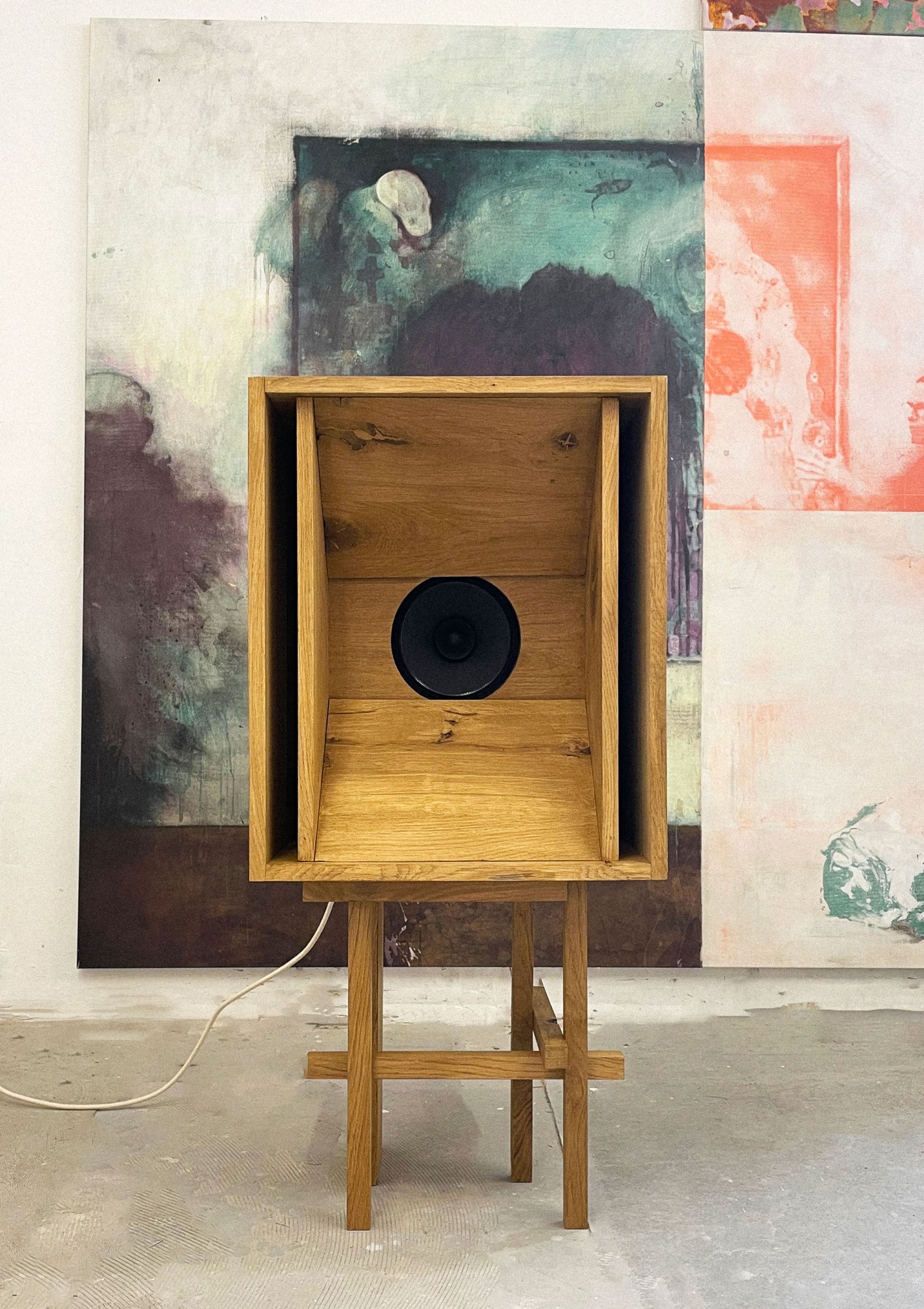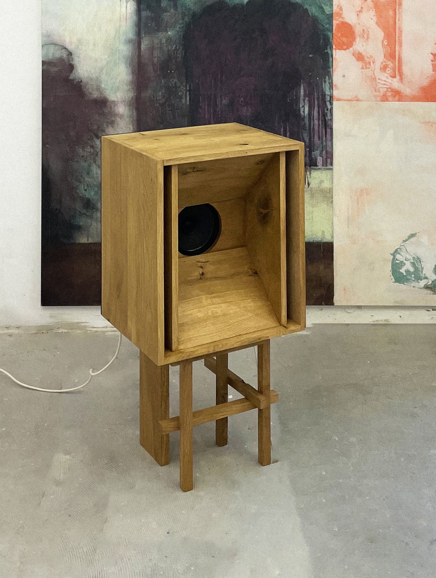 Enceinte, Chêne blanc vernis, 50 × 60 × 40 cm, 2024
