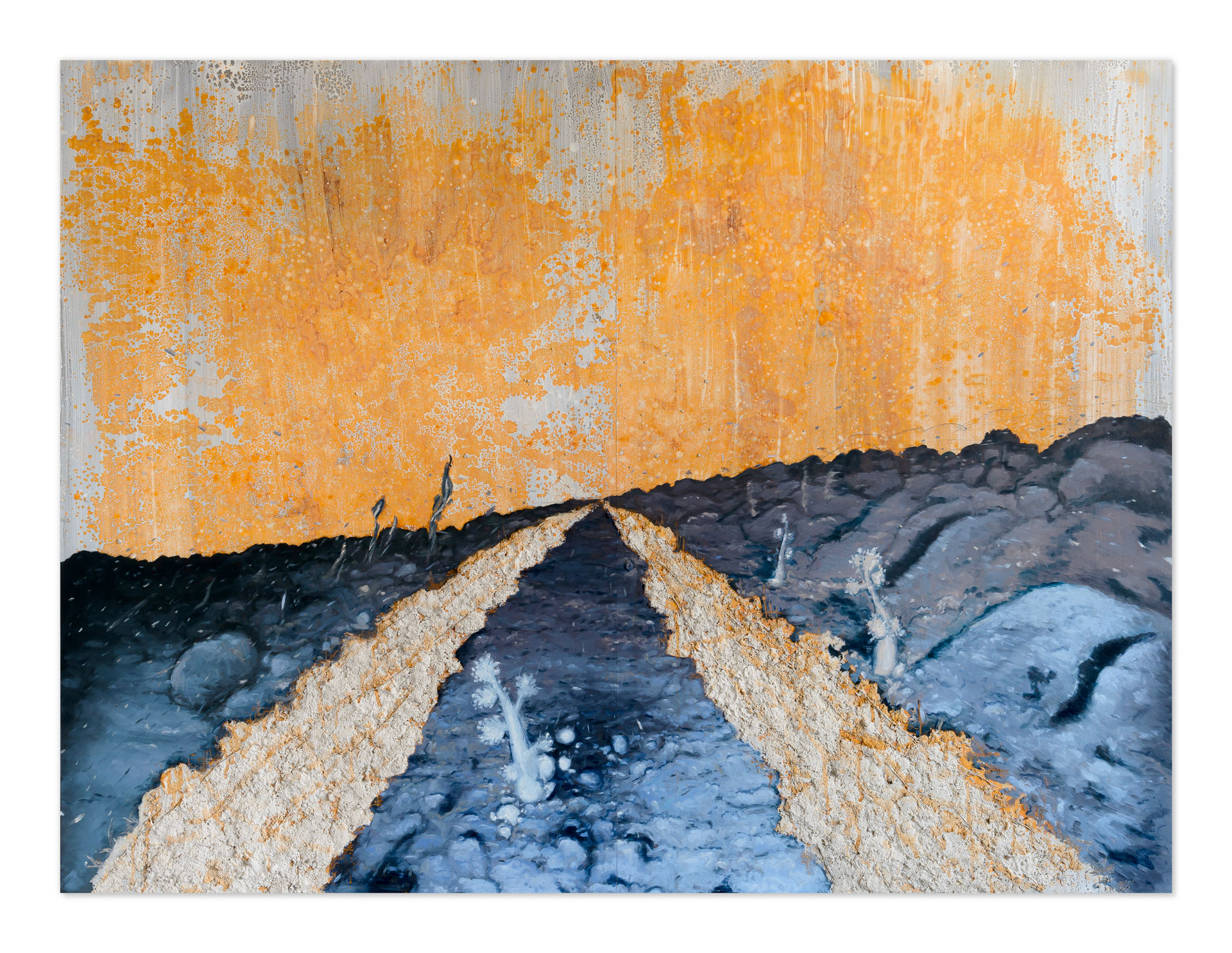 Timeless Perspective, Huile et béton sur acier oxydé, 100 × 150 cm, 2023