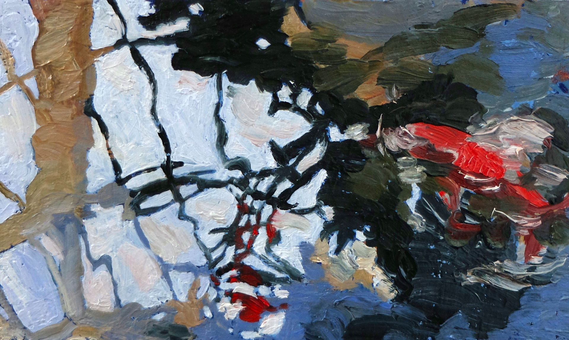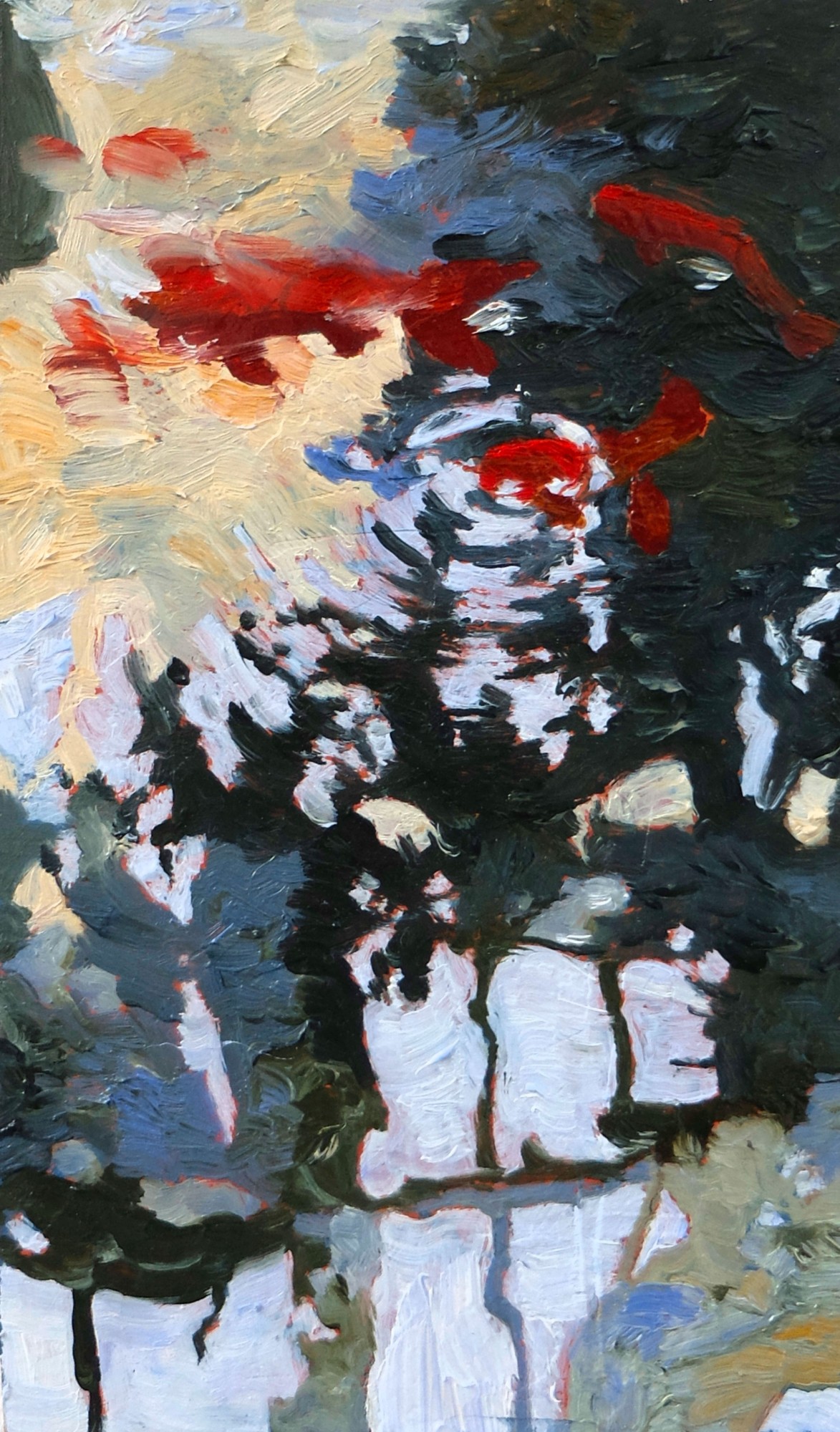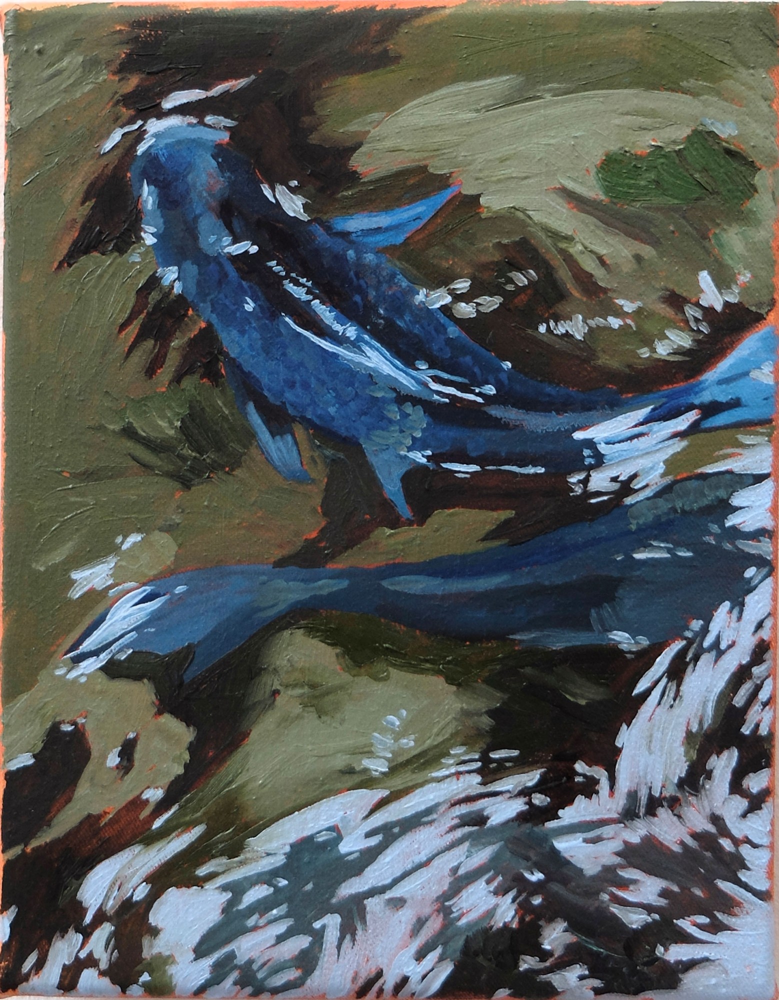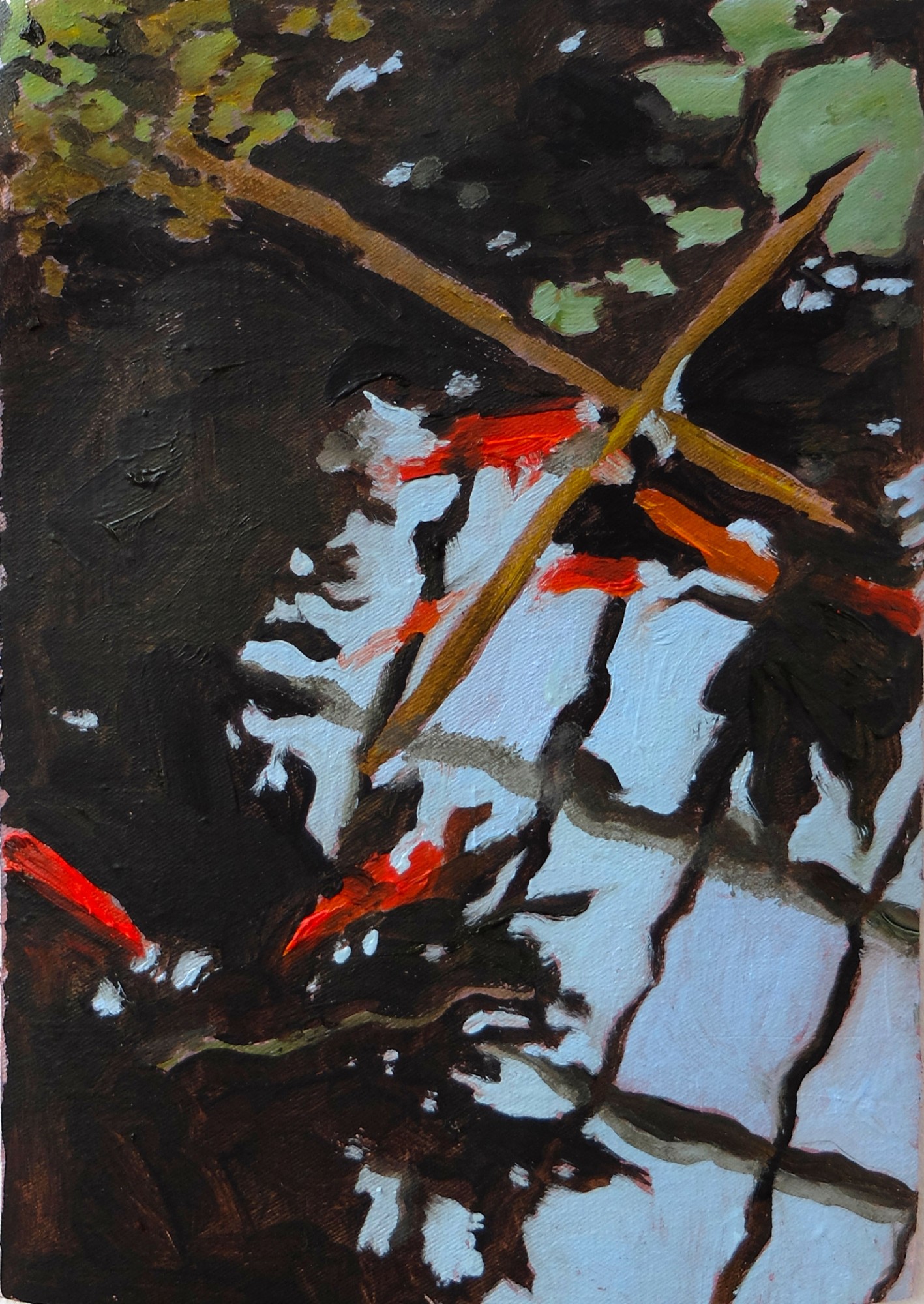 Valentine Esteve, Études (poissons et serre), huile sur papier toilé contrecollé sur bois, 21 × 15 cm, 2023