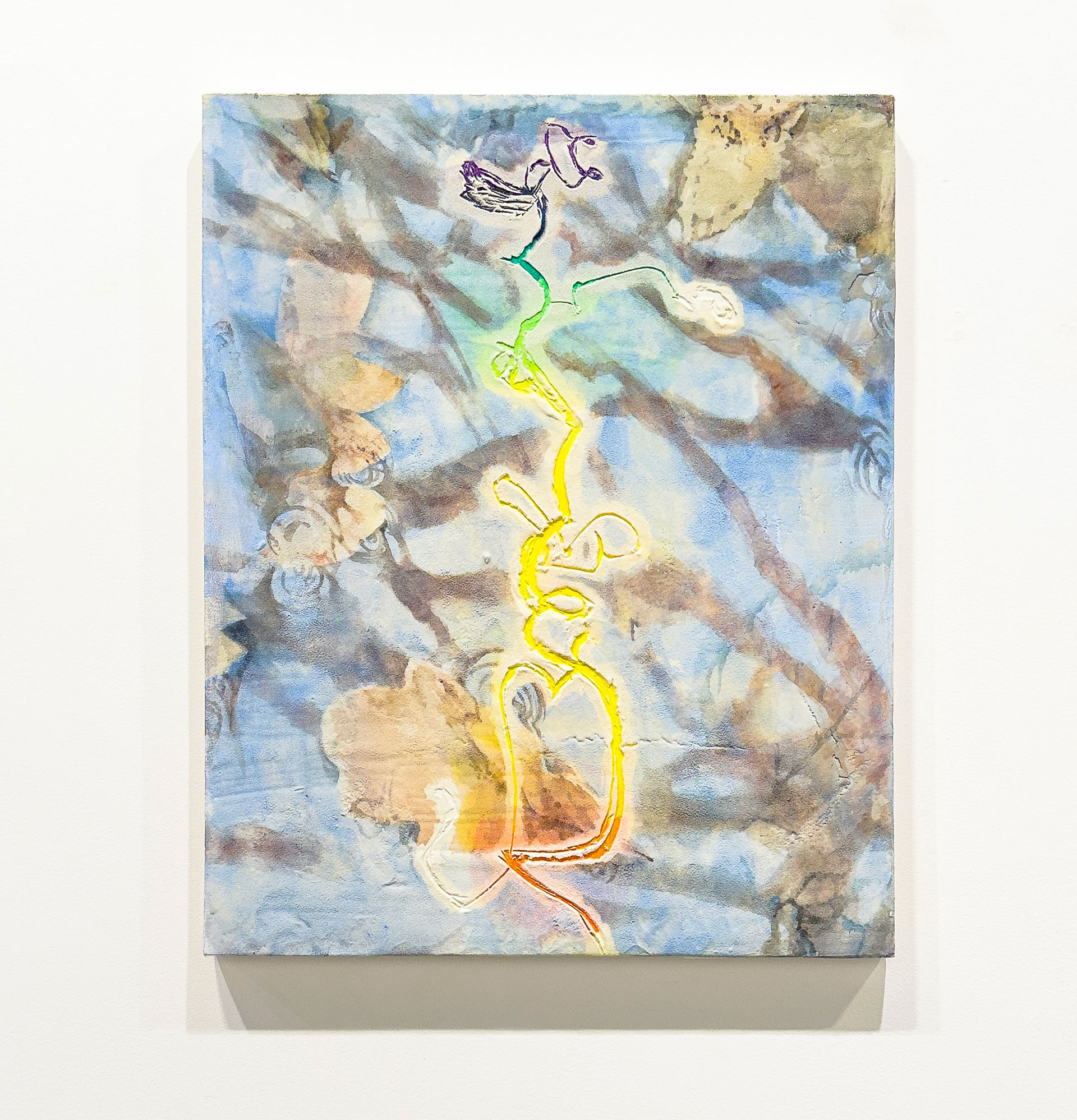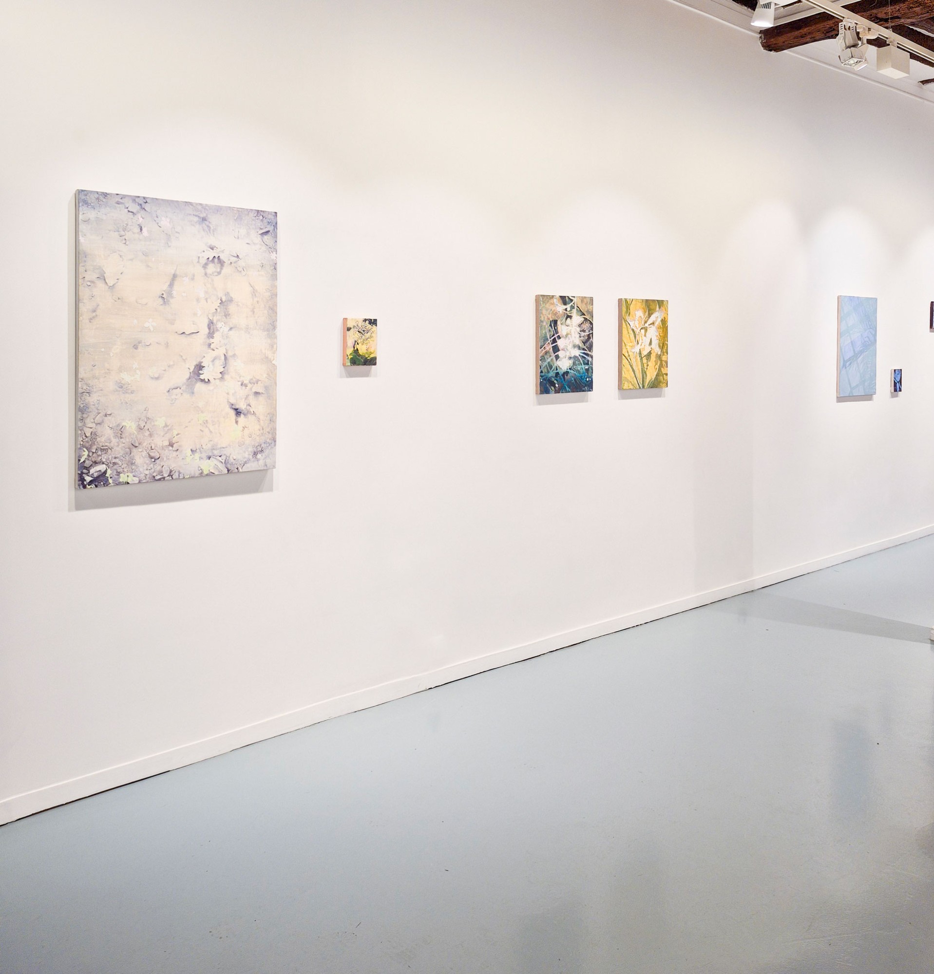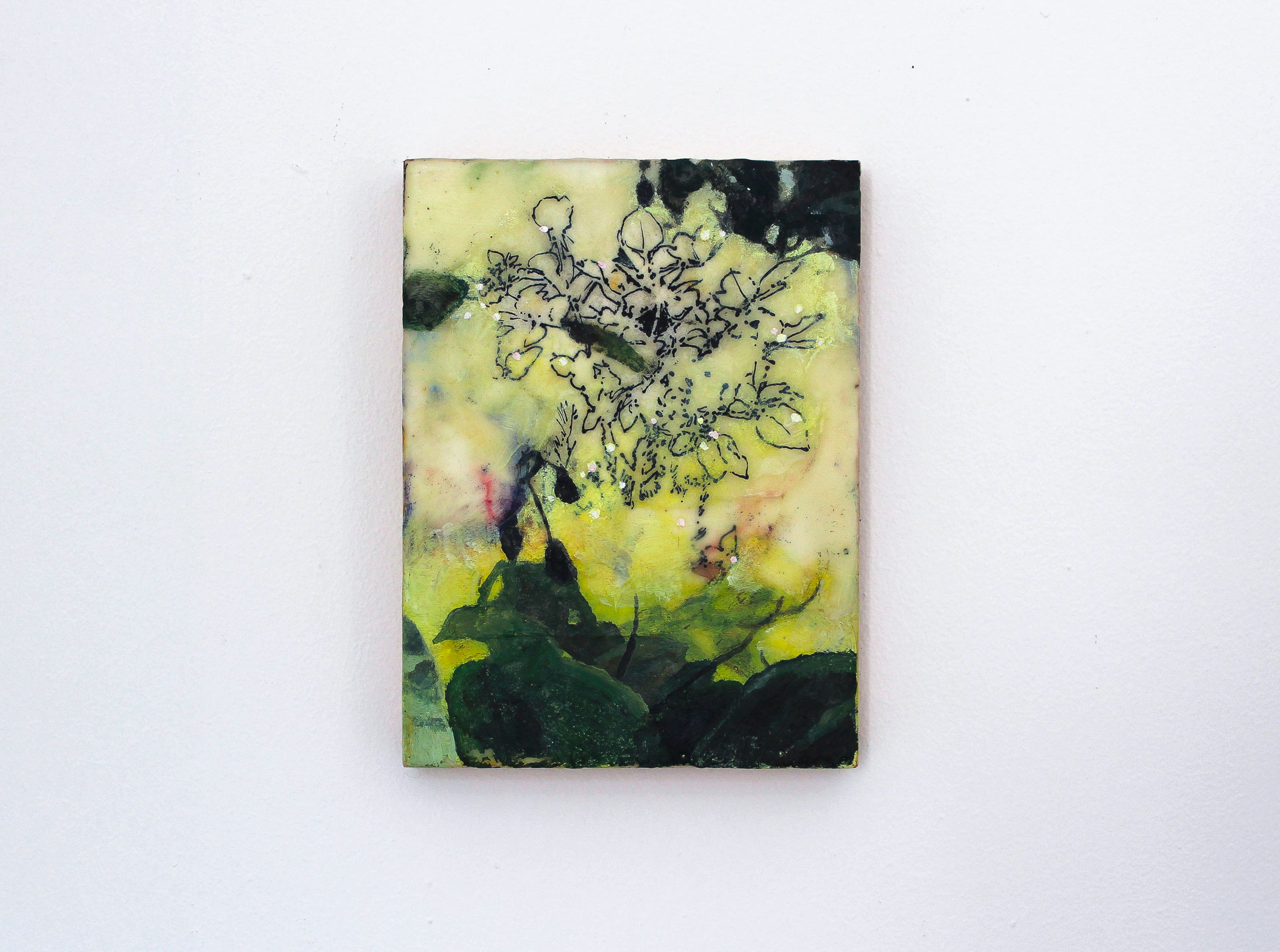 Luc Pommet développe une pratique essentiellement picturale, procédant par strates et par couches successives où s’entremêlent de véritables végétaux, microbilles de verre, caséine, pigment, vernis ou encore papier. Ces œuvres révèlent des éclats de lumière subtilement irisés, apportant une rare profondeur à sa peinture.