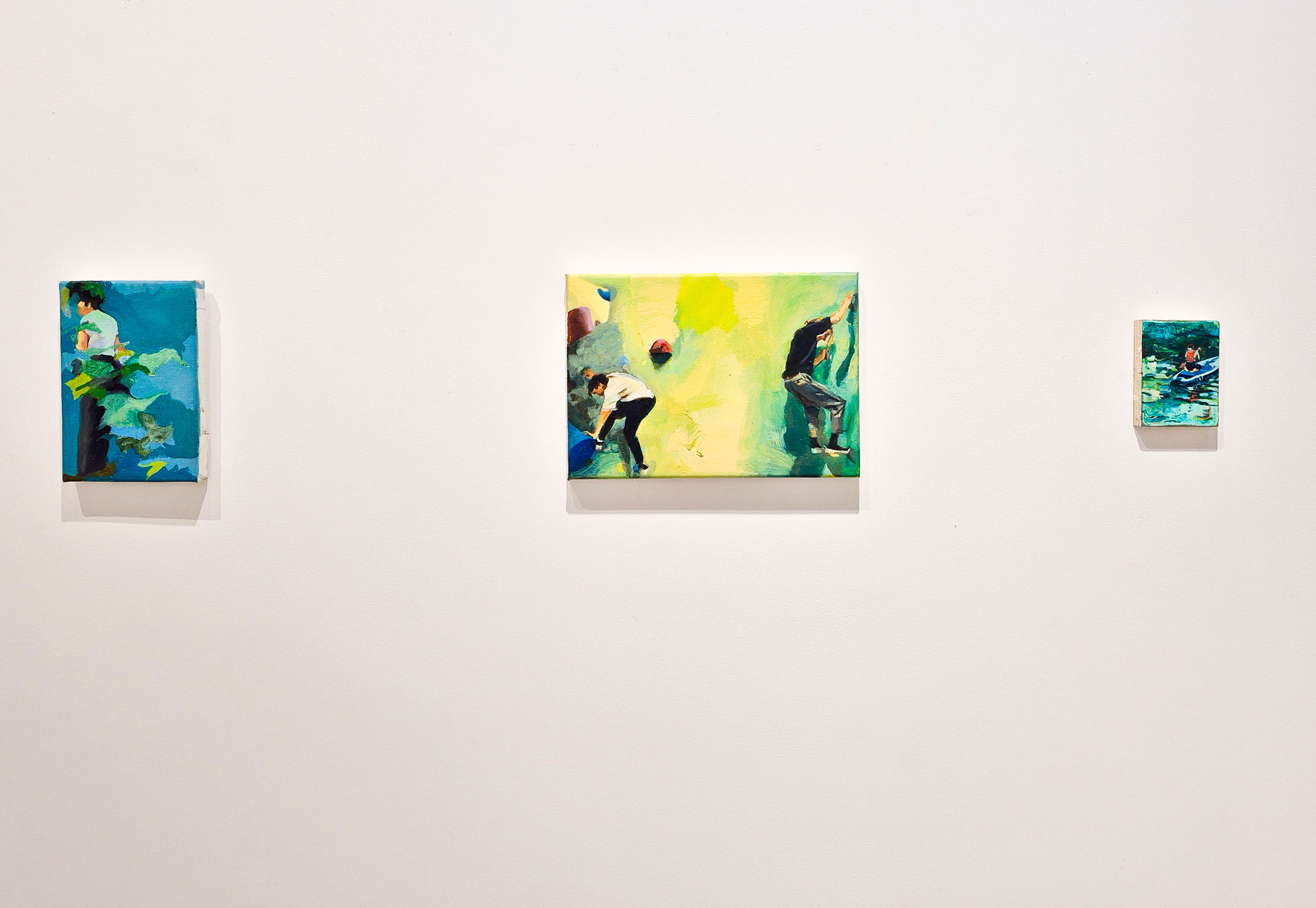 Pour Léa Toutain, le point de départ de sa peinture réside dans les présences qui l’entourent. Le travail ou les loisirs sont souvent les actions qui animent les personnages dans ses huiles sur toiles sur fond de nature. Un concept de communauté émerge alors, où les individus, simultanément solitaires et liés, échangent et transmettent des techniques et des savoirs. Benjamin Collet déploie ses projets dans l’espace par l’intermédiaire d’installations qui s’organisent autour d’un triptyque de pratiques : édition, mobilier et peinture. Ses mobiliers deviennent alors prétextes à s’arrêter et observer tandis que le texte nous donne une vision plus large de ce qui nous est donné à observer. Sa peinture quant à elle, délicate et évanescente convoque notre mémoire.